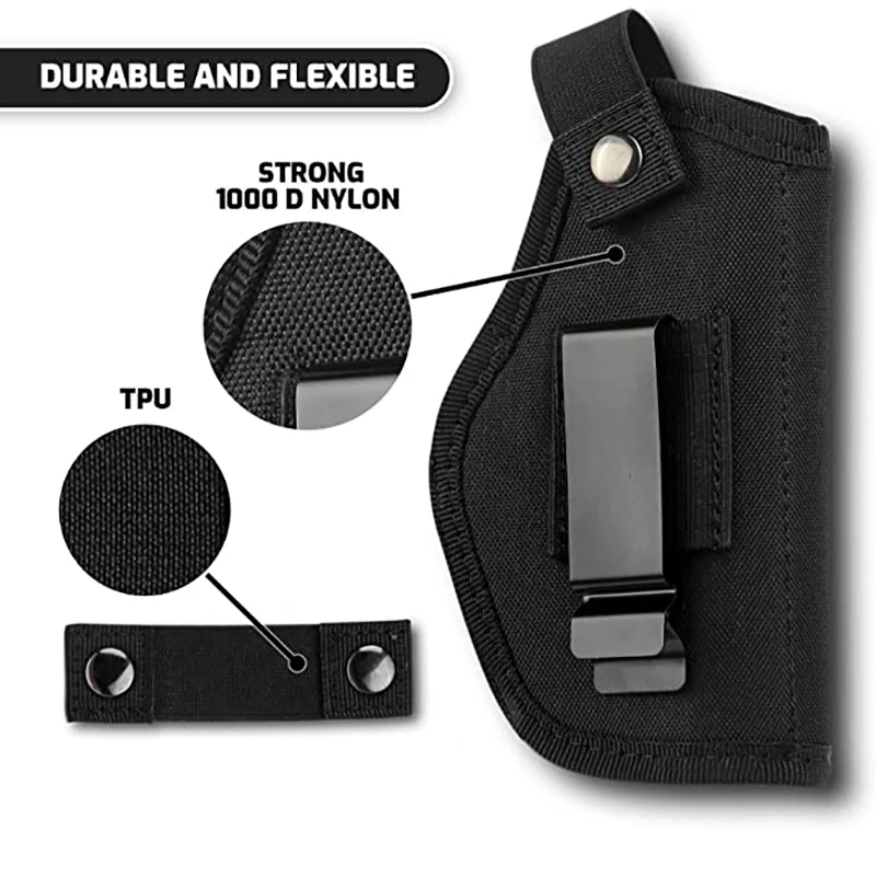 ✔ Sturdy Construction: Made of durable and sturdy 1000D nylon. Our 9mm holster for men features a resistant Zn-Fe plated button, and TPU elastic cord. 2.3″ metal clip features place on outside or inside waistband that you can adjust according to your preference, fit upto 2 inch wide belt.